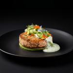Hamburguesa de salmón con yogur de eneldo y pepino