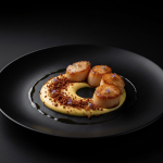 Vieiras doradas, crema de maíz y crujiente de beicon.