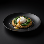 Avena cocida en caldo con espinacas salteadas y huevo poché.