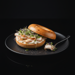 Bagel tostado con pavo, queso crema y brotes.