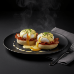 Pan inglés, bacon, huevo poché y salsa holandesa.