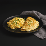 Huevos batidos cuajados con queso fundente.