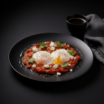 Huevos escalfados en salsa de tomate con pimiento y comino, feta desmigada.
